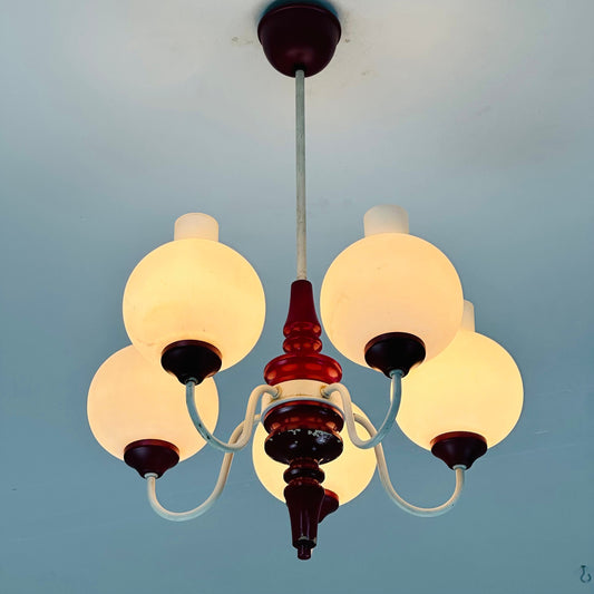 German mid century 5 Opal Glass and Bordeaux Body Chandelier by Kaiser Leuchten, 1960s, Germany