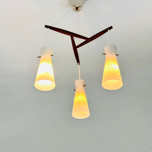Mid century 3-Arms Teak pendant lamp and opal glass Denmark 1960s