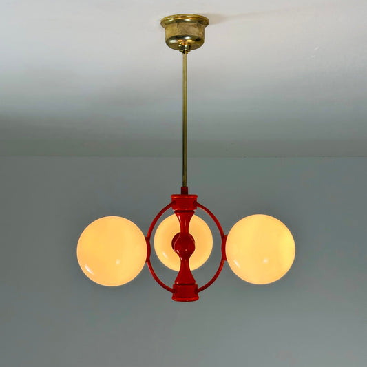Mid century German Atomic orange Kaiser chandelier with 3 globes. 1960s