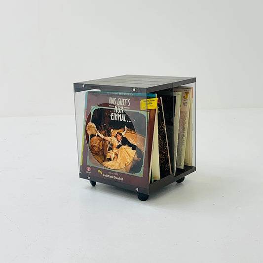 mid century record container, vinyl record shelf, record stand, LP shelf on wheels, phono trolley, by Dietel west Germany 1970a unused box