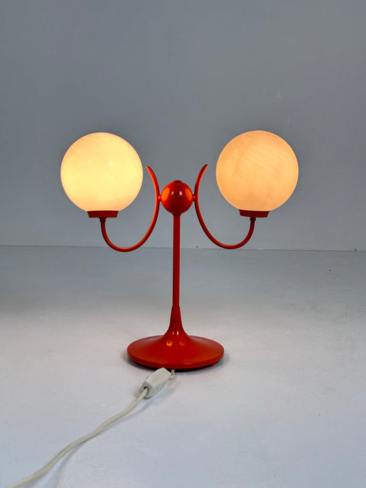Opaline glass, orange tulip shaped base makes this stunning space age mid century table lamp . Made by Kaiser Leuchten, Germany 1970s