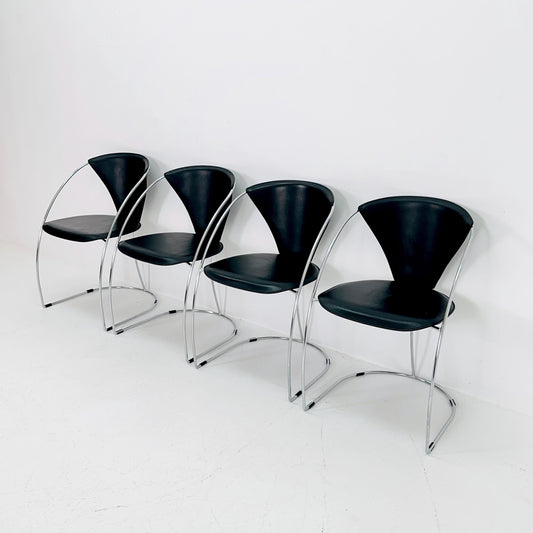 Set of 4 Mid-Century Modern Dining Armchairs by Arrben | Model Linda, Black Leather & Chrome, Italy 1980s
