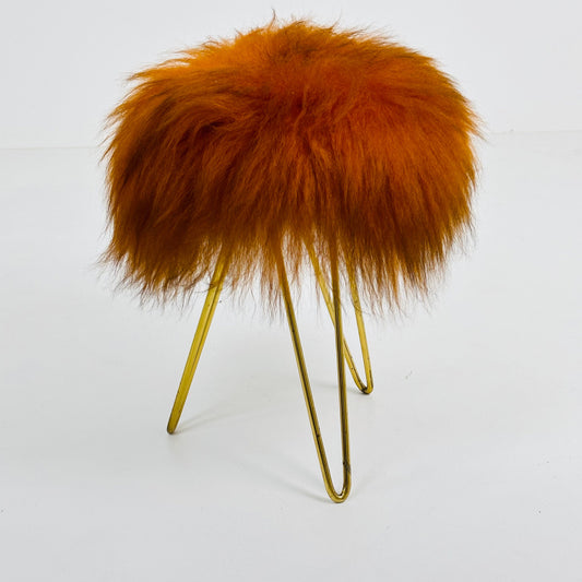 Beautiful midcentury orange flokati stool with goat hair cover and tripod hairpin feet. 1950s