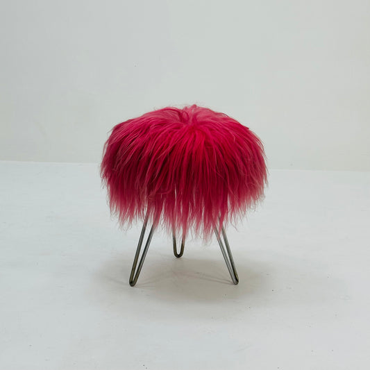 Beautiful mid-century pink Flokati stool with goat hair upholstery and three-legged hairpin feet.1960s Germany