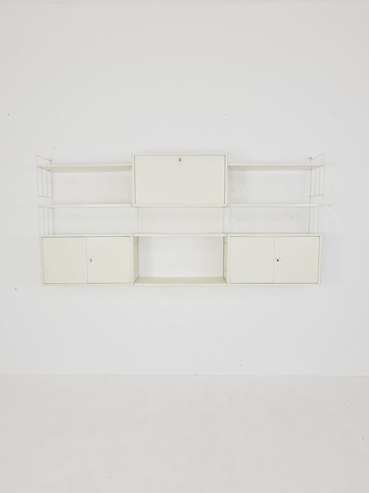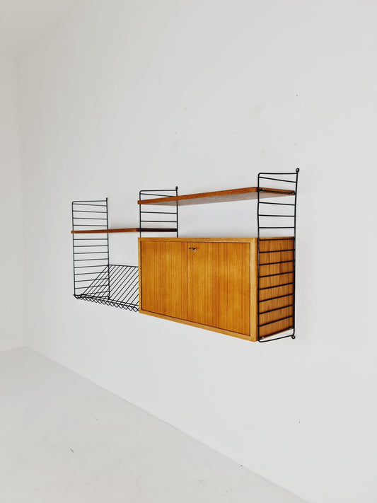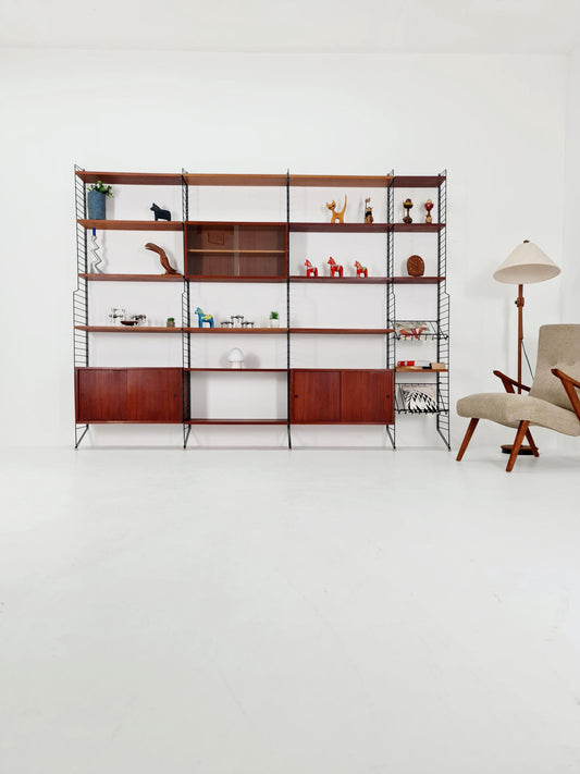 Wall-mounted original Swedish string shelf-system, bookcase cabinet teak by Nils & Kajsa Strinning, 1960s