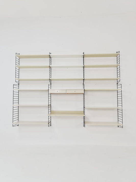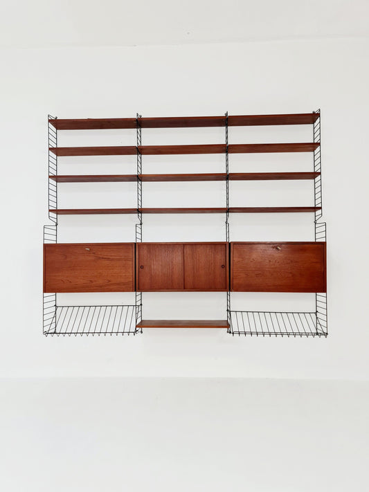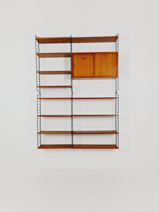 Wall-mounted original Swedish string shelf-system, , bookcase teak by Nils & Kajsa Strinning, 1960s