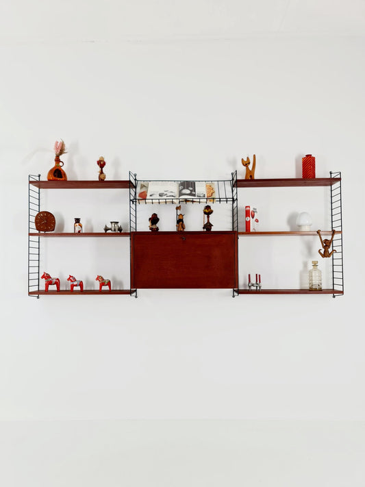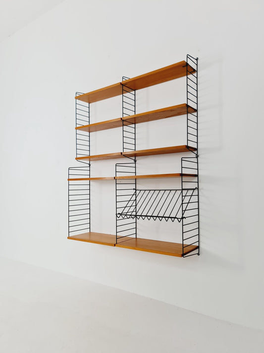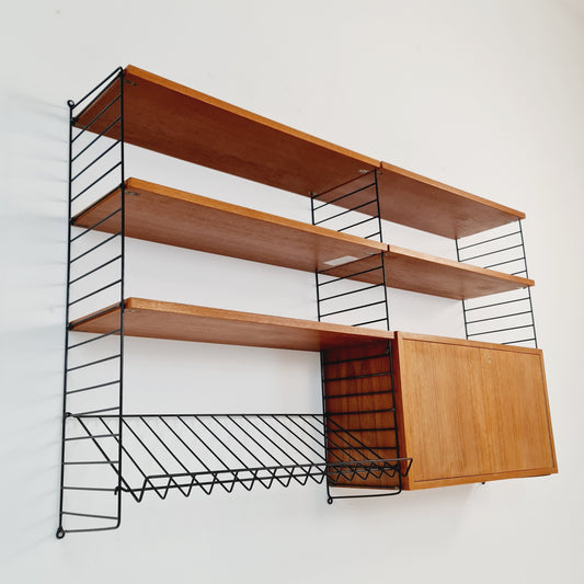 Wall-mounted original Swedish string shelf-system, drawers, bookcase teak by Nils & Kajsa Strinning, 1960s