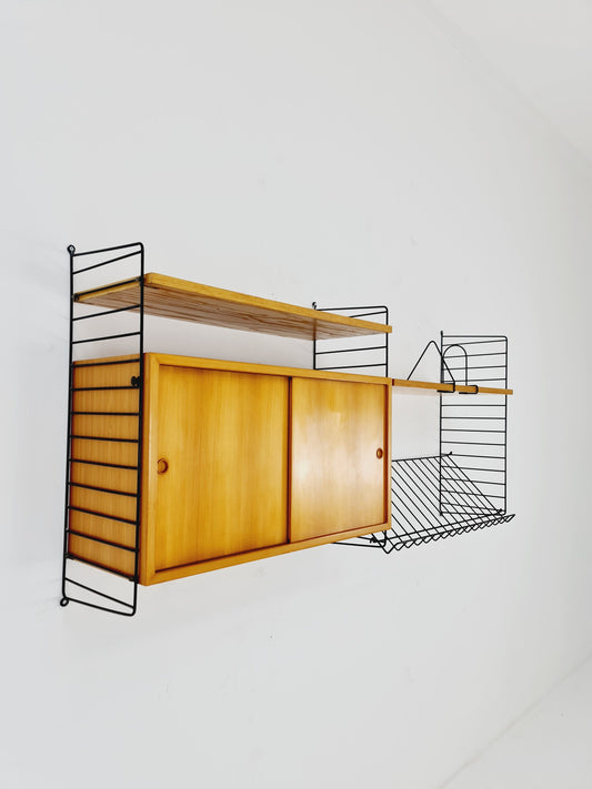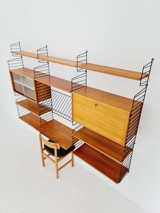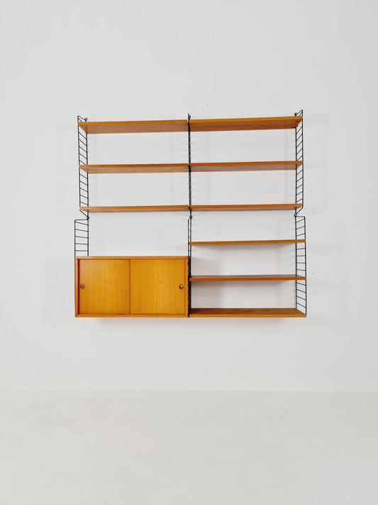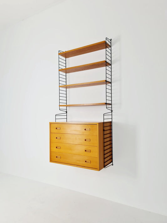 Wall-mounted original Swedish string shelf-system, drawers, bookcase Ash wood by Nils & Kajsa Strinning, 1960s