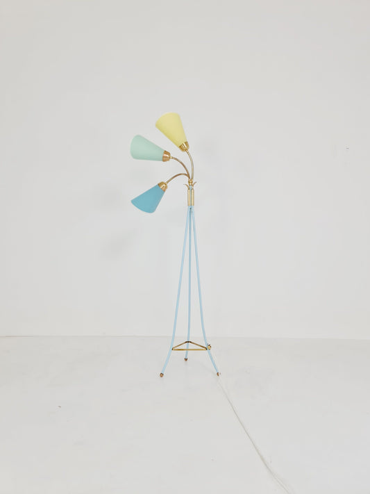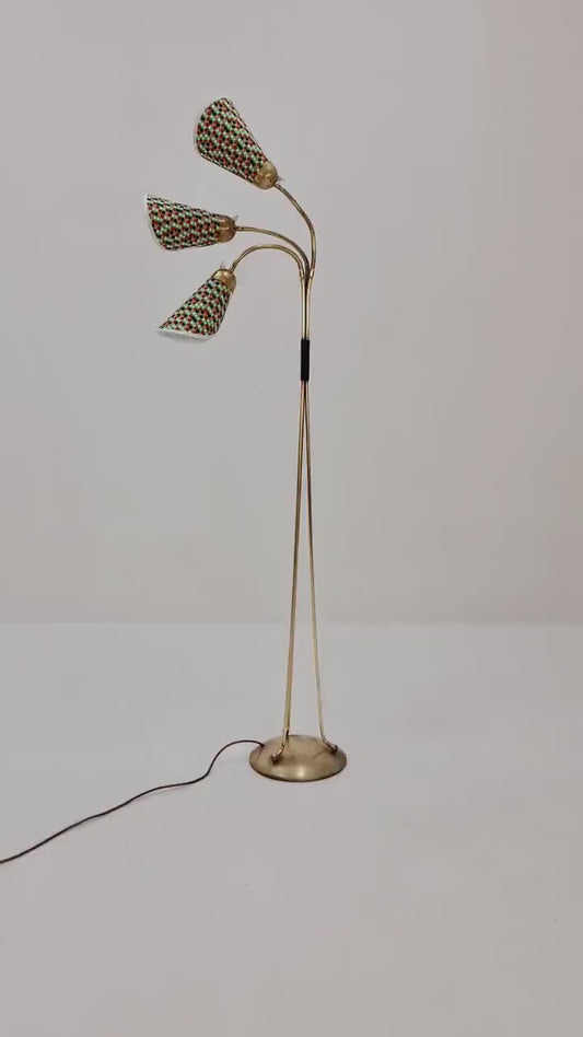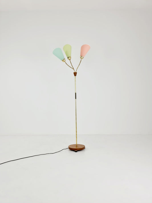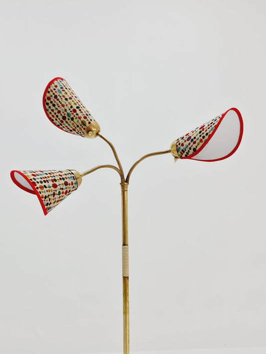 German Modern Colorful three flex arms brass floor lamp, tütenlampe, 1950s