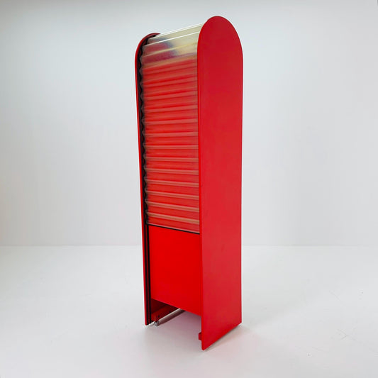 Rare Klaus Vogt Cabinet for Thut Möbel — Swiss Minimalist Space Age Design — Red Plywood Storage Cabinet with Scobalit Roller Door 1970s