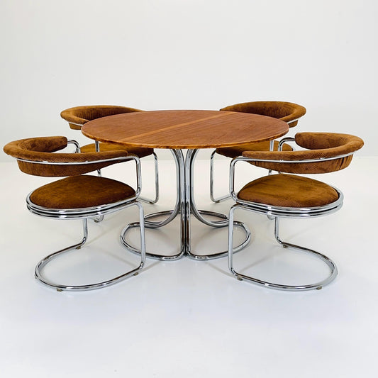 Mid Century Modern Dining set “Maia” Round Dining Table by Giotto Stoppino for Bernini, and 4x Cognac velvet dining armchairs Italy 1980s