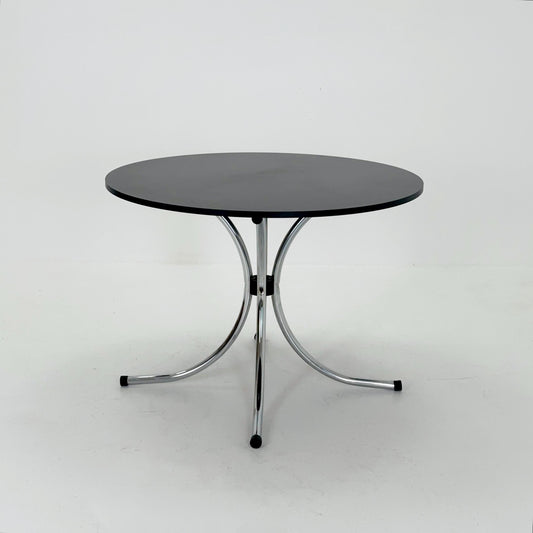 Mid-century dinning round table in chrome-plated steel with round solid black top, 1980s Italy