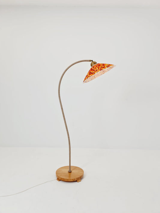 Rare Midcentury vintage gooseneck floor lamp in Wood and Dansih cord shade by Marksljöd Sweden, 1940s