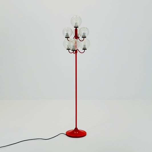 Mid-Century 7-Arm Space Age Floor Lamp by Kaiser, Germany, 1960s — Red Metal Base & Frosted Glass Shades