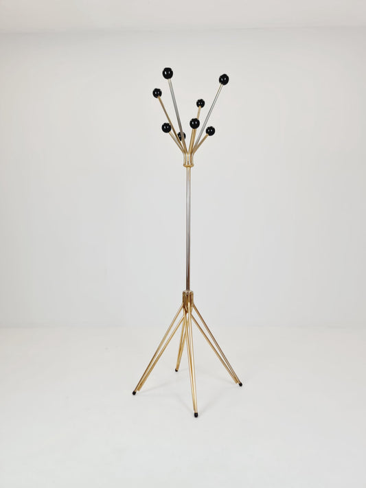 Mid-Century Modern Brass Coat Rack – Atomic Style with Black Ball Finials