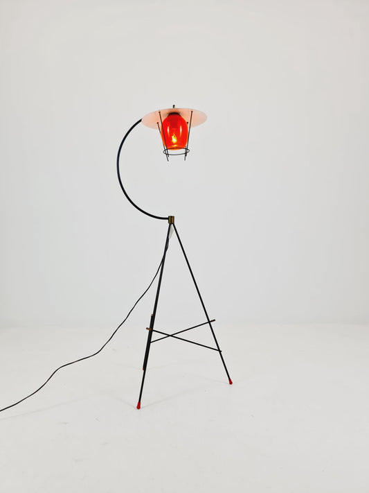 Mid century Tripod Italian floor lamp Red Glas & Brass Details 1950s