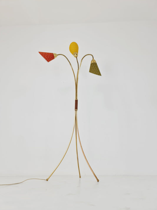 German Modern Colorful three flex arms brass floor lamp, tütenlampe, 1950s