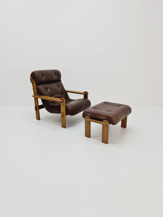 Mid Century Scandinavian Solid Oak & Leather lounge chair/ Easy chair with Ottoman, 1960s