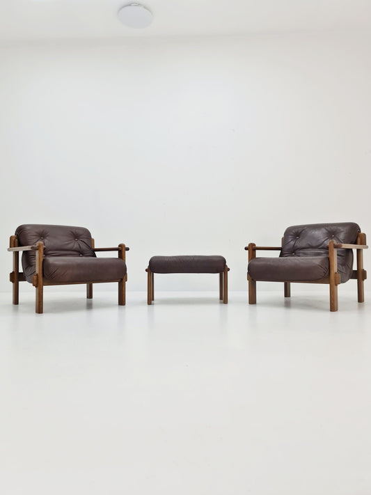 Mid Century Scandinavian Solid Oak & Leather lounge chairs/ Easy chairs Set of 2 with Ottoman, 1960s