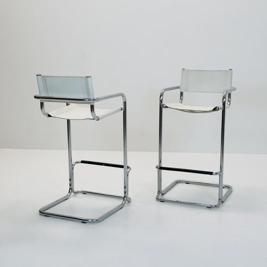 Set of 2 Mart Stam white leather and chrome Italian Mid-Century Modern barstools, 1970s