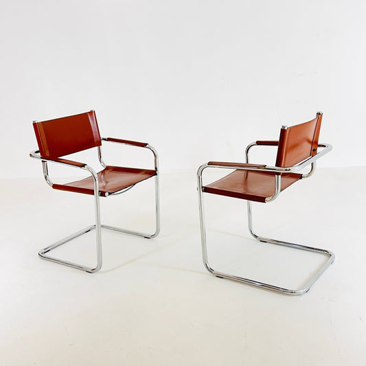 Set of 2 Mid century S34 cognac Leather tubular armchairs by Mart Stam & Marcel Breuer 1980s Italy