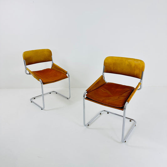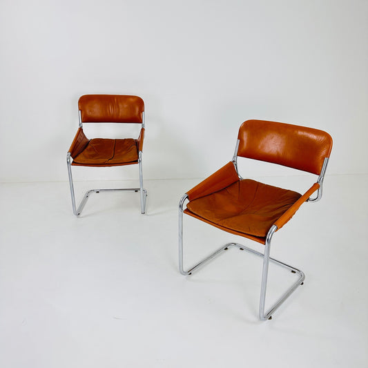 Set of 2 cognac Leather & chrome tubular sling chair, Italy 1970s