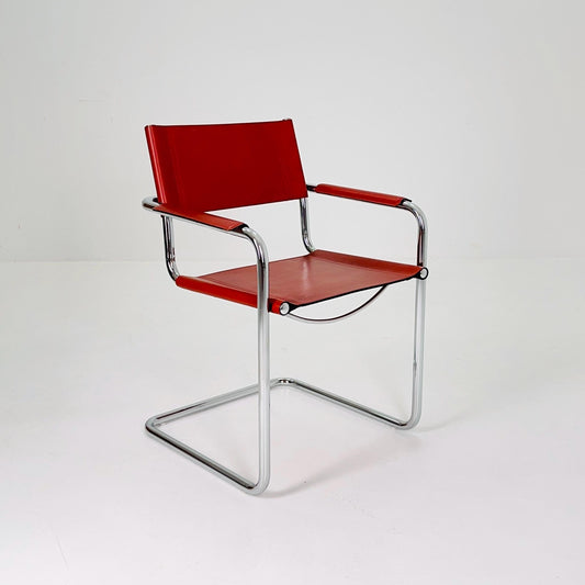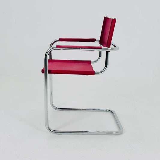 Mid Century iconic Mart Stam S34 armchair / Bauhaus chrome tube steel and burgundy faux leather / 80s vintage cantilever chair italy