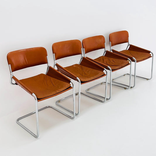 Set of 4 Mid century cognac leather & chrome tubular sling chair, Italy 1970