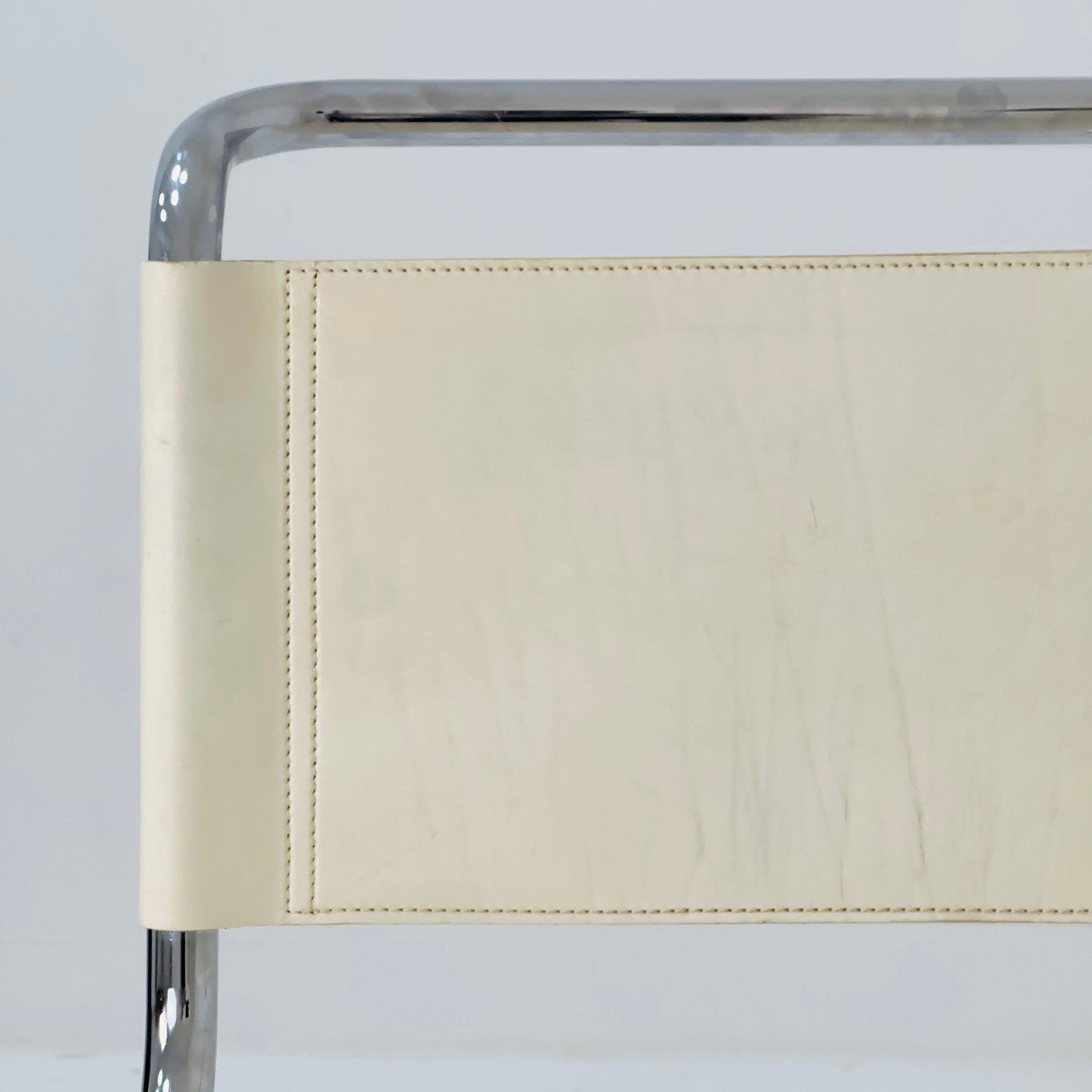 The "Weissenhof Chair", also known as the MR 10, was designed in 1927 by the German-American architect Ludwig Mies van der Rohe (1886-1969). Ludwig Mies van der Rohe is considered one of the most important modernist architects. His most important projects include the multi-family houses in the Weissenhof settlement in Stuttgart, the German pavilion for the 1929 World Exhibition in Barcelona, and the Villa Tugendhat in Brno. the cantilever chair date from the 1980s . Chrome-plated tubular steel frame, seat and backrest made of thick, white-colored leather. Immaculate condition. Leather parts with slight signs of wear, but without deep scratches and without open seams.